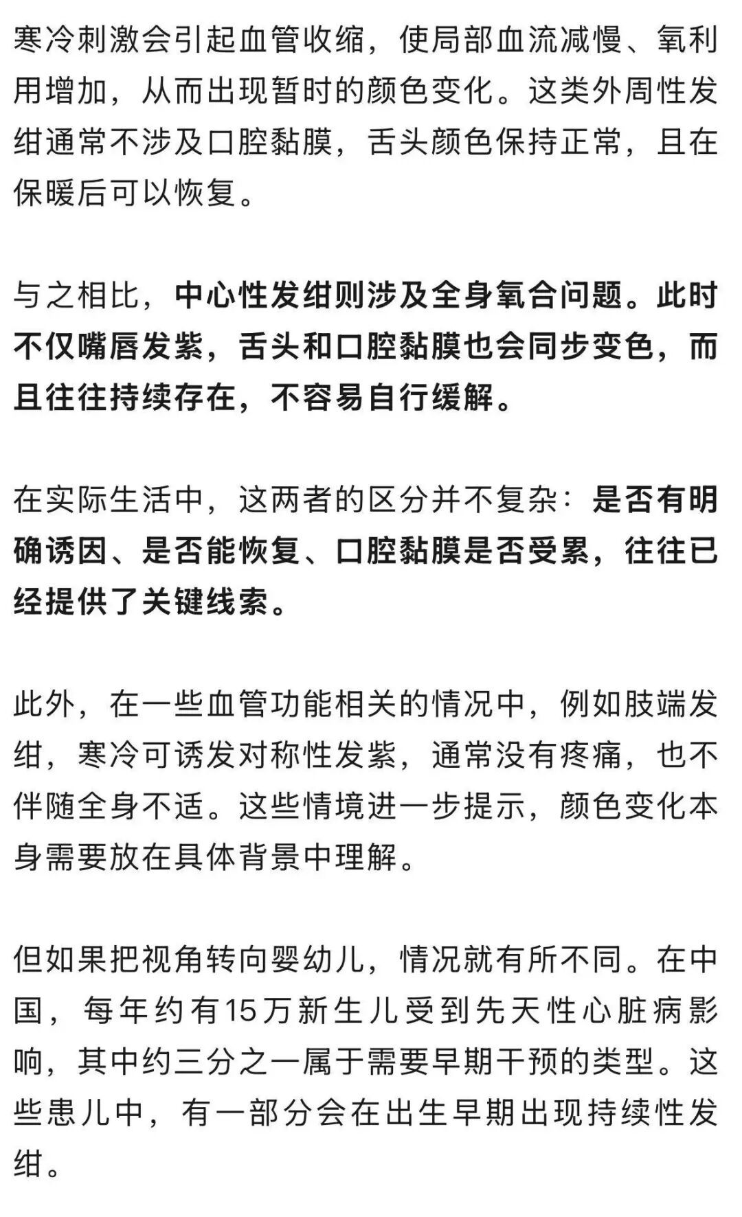 因此,婴幼儿中如若出现捏续嘴唇发紫,尤其跟随喂养艰难、哭闹时加剧或体重增长不良,应尽早就医评估。
