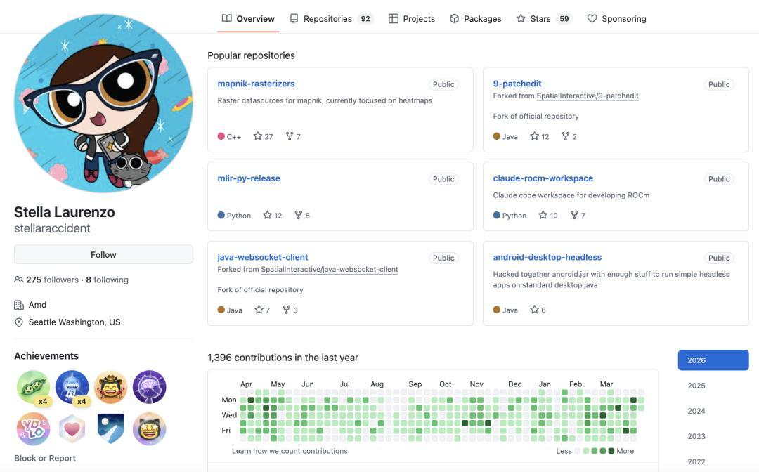 证实该用户的 GitHub 个东说念主府上和磋议 Linkedln 帖子骄贵,这位发帖东说念主恰是芯片制造商 AMD 东说念主工智能部门足下 Stella Laurenzo。