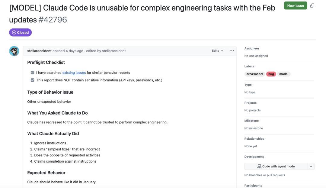 她没绕任何弯子,径直在 issue 标题中就带着起火:“2 月份的更新导致 Claude Code 无法用于复杂的工程任务”。
