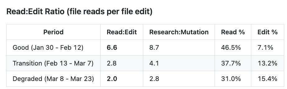 拜访数据明晰地呈现了这一退化:1 月份时,Claude Code 改一次代码平均要读取 6.6 次文献,只怕出现谬误。这算是它的“细致期”,会先读取方向文献、关联文献,全局检索用法,放哨头文献与测试用例,再进行精确修改。
