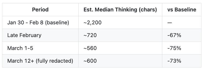 1 月份时,Claude Code 每次念念考的内容约莫有 2200 个字符,能看出是在安祥琢磨问题。可到了 2 月底,念念考字符数径直暴跌至 720 个,相配于减少了三分之二的念念考量,念念考深度下落了 67%。