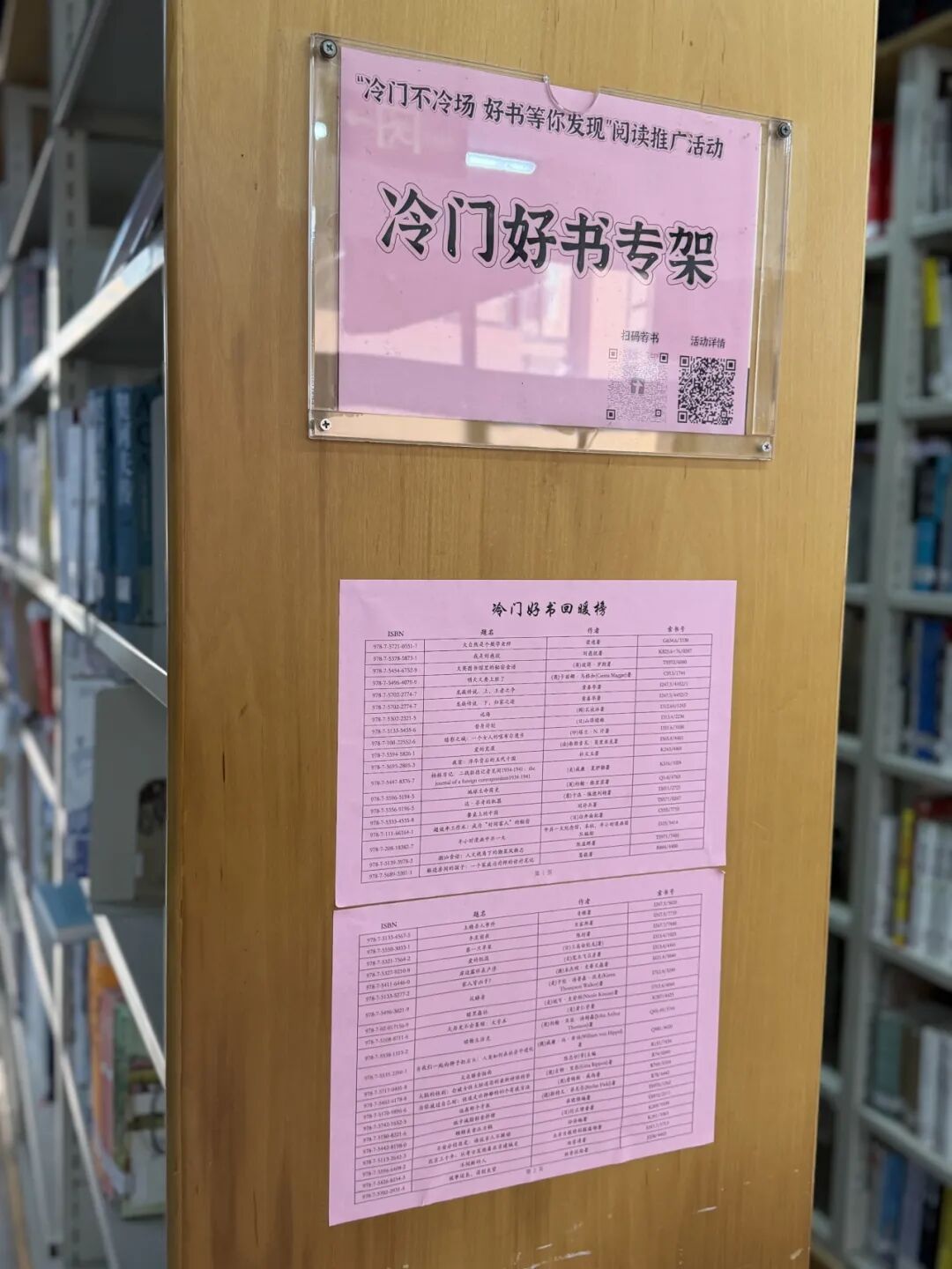 贴在专架上的“冷门好书回暖榜”展示借阅率高的冷门好书书目